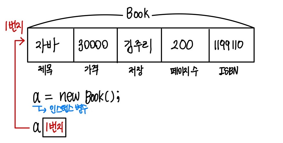 a=new Book(); // 생성된 객체 저장, a는 인스턴스 변수(참조형 변수, 실체를 가리키는 변수)
