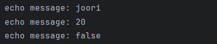 콘솔에는 "echo message: joori", " echo message: joori : 30", " echo message: joori : true"가 출력되고, 클라이언트는 "JOORI" 문자열을 받게 된다.