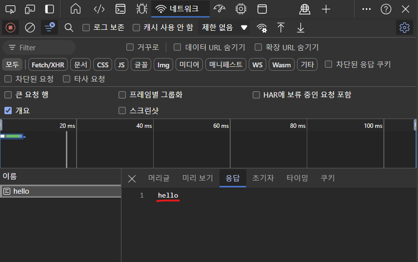 예를 들어, /api/echo/hello와 같은 요청이 오면 콘솔에는 "echo message: hello"가 출력되고, 클라이언트는 "hello" 문자열을 받는다.