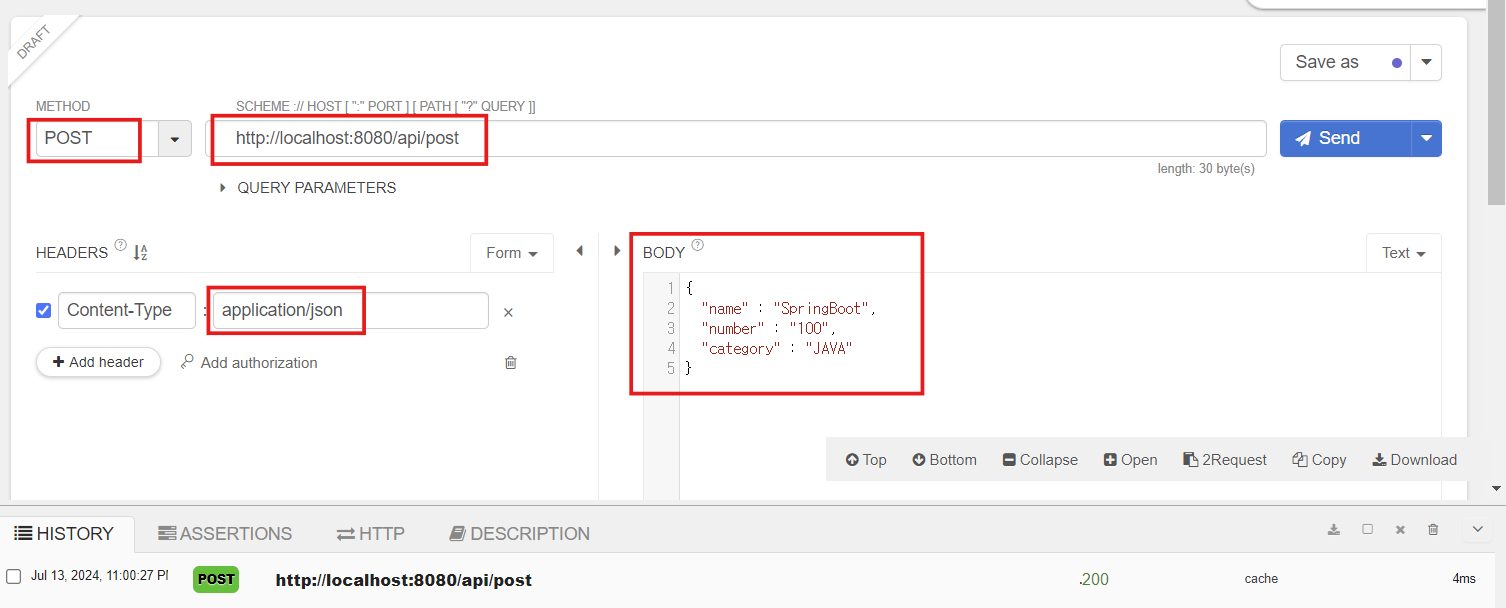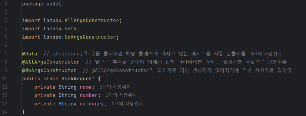 @RequestBody 어노테이션을 통해 HTTP 요청 본문이 BookRequest 객체로 자동 변환된다. 메서드 내부에서는 변환된 BookRequest 객체를 사용하여 필요한 로직을 수행할 수 있다. 위 코드에서는 단순히 객체를 콘솔에 출력하고 반환한다.