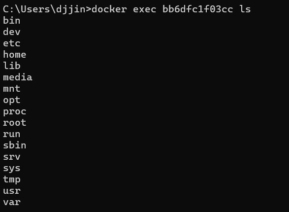 두 번째 터미널에서 컨테이너가 잘 작동하고 있는지 exec 명령어를 통해 ls 명령어를 전달하여 확인한다.
