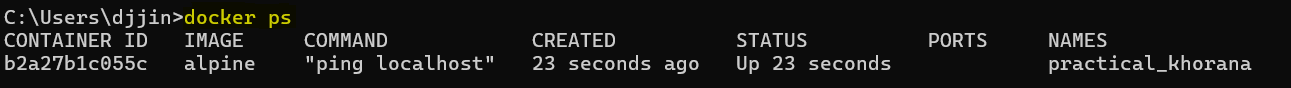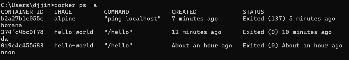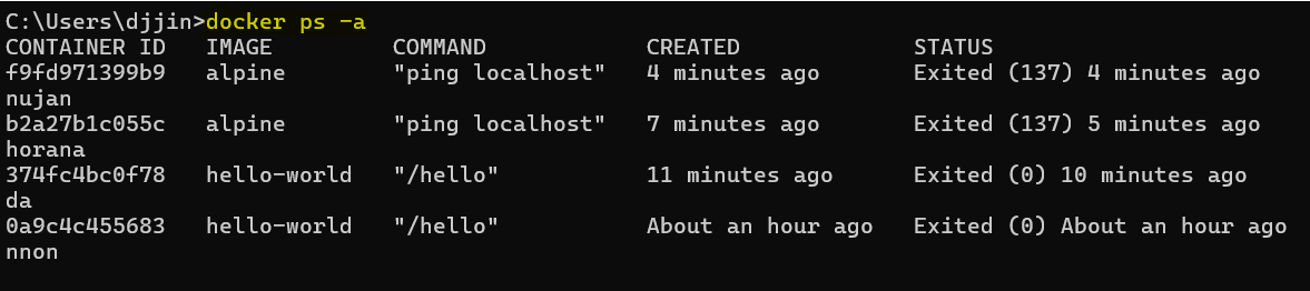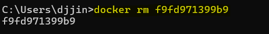 실행 중인 컨테이너는 먼저 중지한 후에 삭제 가능하기 때문에, docker ps -a로 중지된 컨테이너 확인.