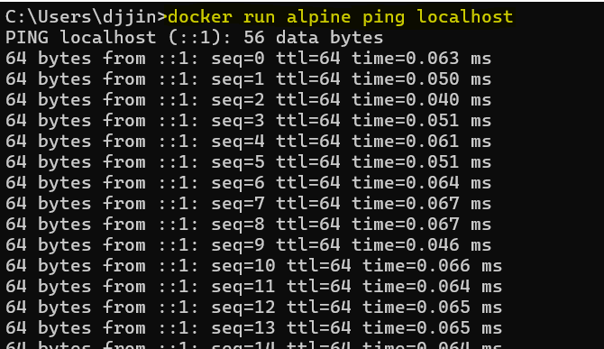 실행 중인 컨테이너에 명령어를 전달하기 위해 먼저, 첫 번째 터미널에서 컨테이너 하나를 실행한다.