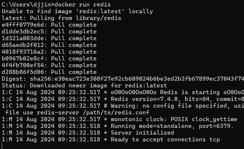 docker run redis 명령으로 첫 번째 터미널에서 redis 서버를 작동시킨다.