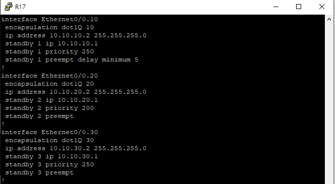 standby 1 preempt # R17 장애 후 복귀 시에도 선점하지 않음 (R17 유지)