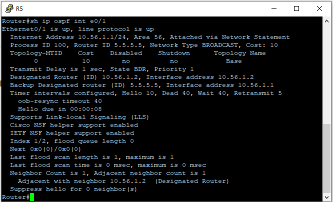 - DR: R5 (자기 자신, Router ID = 5.5.5.5)