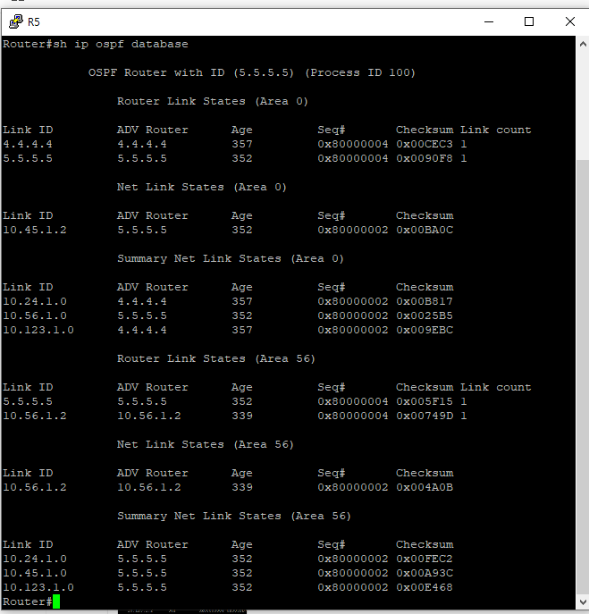 R5 (Area 0 + Area 56에 속한 ABR)에서도 LSDB 확인.