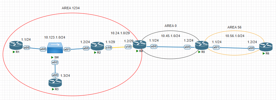 ABR(2개 이상의 area에 속한 라우터)인 R4가 Area 0의 네트워크(10.45.1.0)와 Area 56의 네트워크(10.56.1.0)를 요약해서 Area 1234로 전달하였다.
