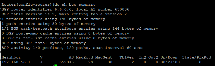 neighbor 192.168.56.2 remote-as 650006 # EBGP R6에 연결