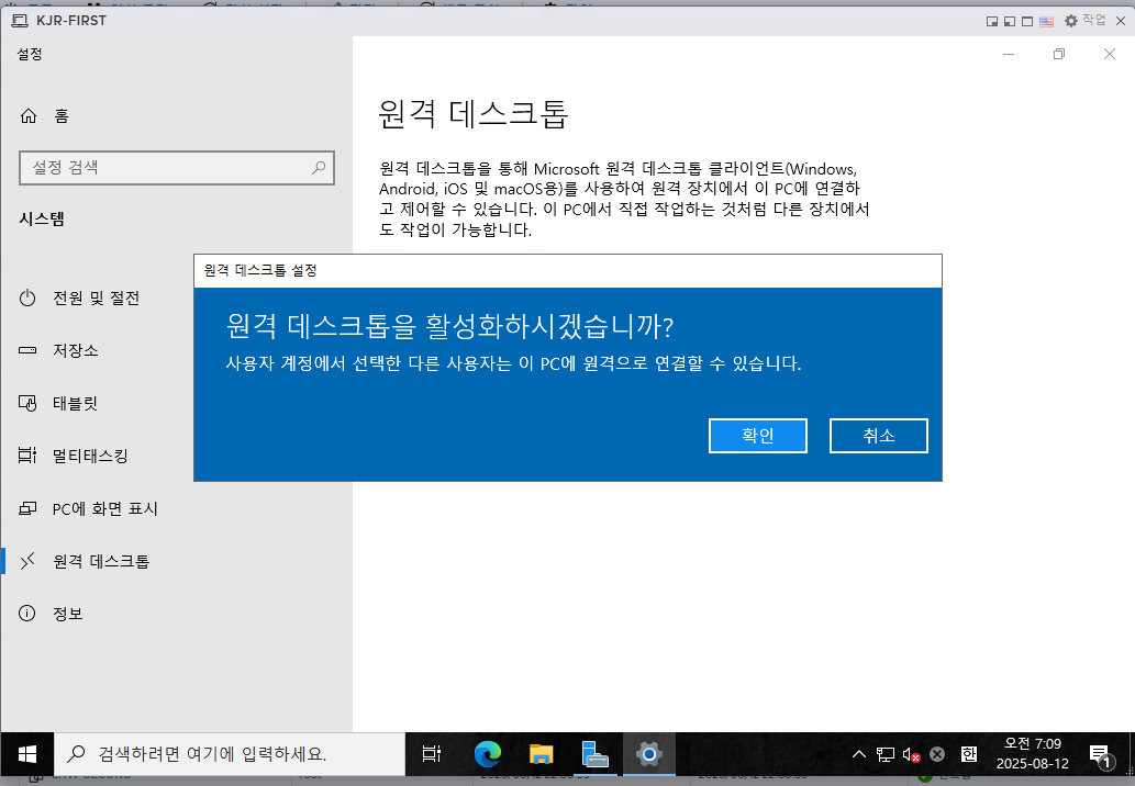 - 원격 데스크톱 활성화 및 외부 서버 접속 테스트