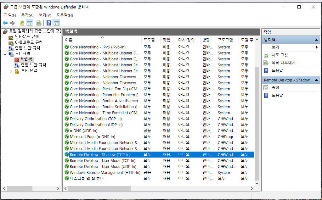 방화벽에서 Remote Desktop 허용된 것 확인.