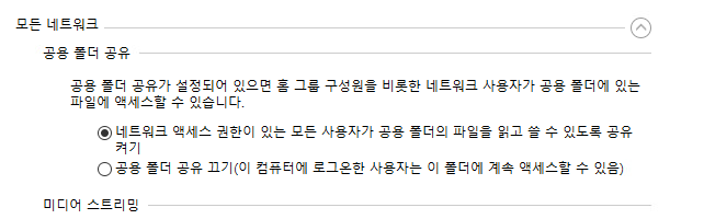 [제어판] - [네트워크 및 인터넷] - [네트워크 및 공유 센터] - [고급 공유 설정]에서