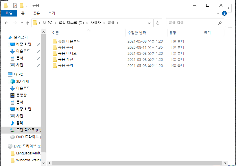 위 공용 폴더에 외부에서 접속한 컴퓨터에 공개할 파일을 추가하면 된다.