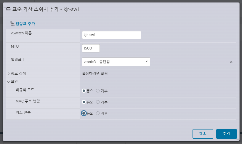 각 가상스위치 위에 포트 그룹 추가 (포트그룹 이름은 스위치와 동일하게 부여)