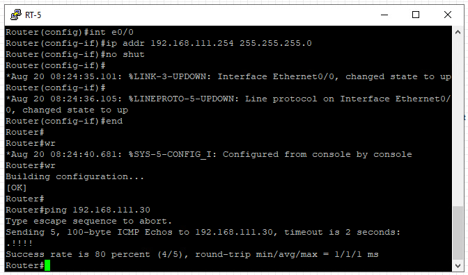 RT-5 라우터 인터페이스 IP 설정 및 핑 테스트