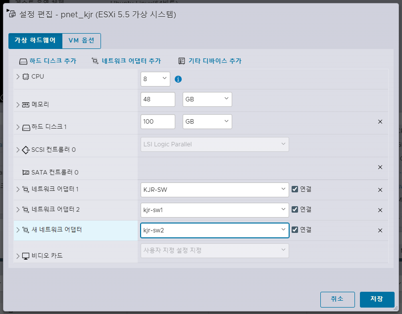 pnet 가상머신에 sw1, sw2 네트워크 어댑터 추가.