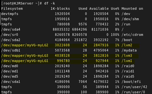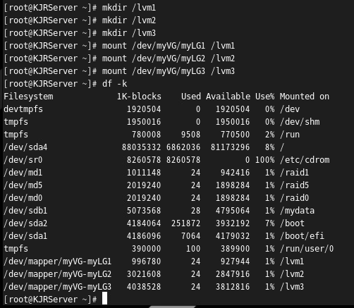 - 각각 포맷(ext4) 후 /lvm1, /lvm2, /lvm3 디렉터리에 마운트