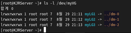 Logical Volume(myLG1, myLG2, myLG3) 이 정상적으로 VG 안에 포함되었음