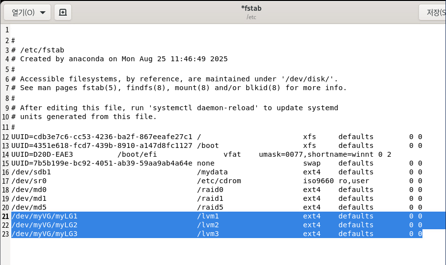 - /etc/fstab에 등록해서 재부팅해도 자동 마운트되도록 설정