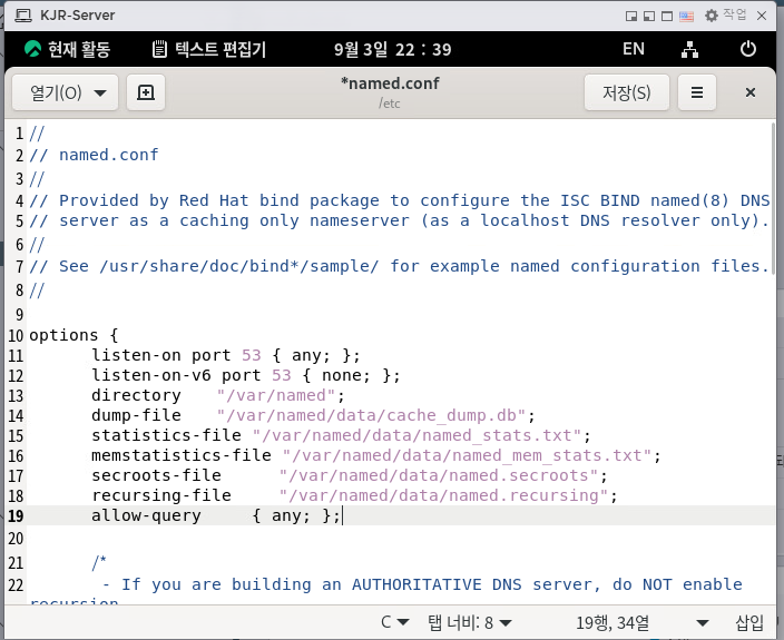 Server 가상머신을 캐싱 전용 네임 서버로 구축하기 위해 캐싱 전용 네임 서버와 관련된 설정 파일인 /etc/named.conf를 열어 수정한다.