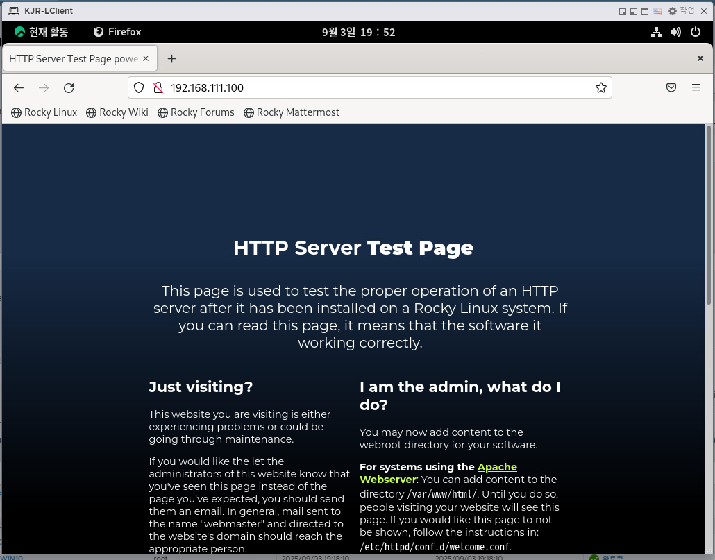 - 클라이언트(LClient)에서 서버 IP(192.168.111.100)로 접속하여 Apache 기본 테스트 페이지가 열리는 것 확인