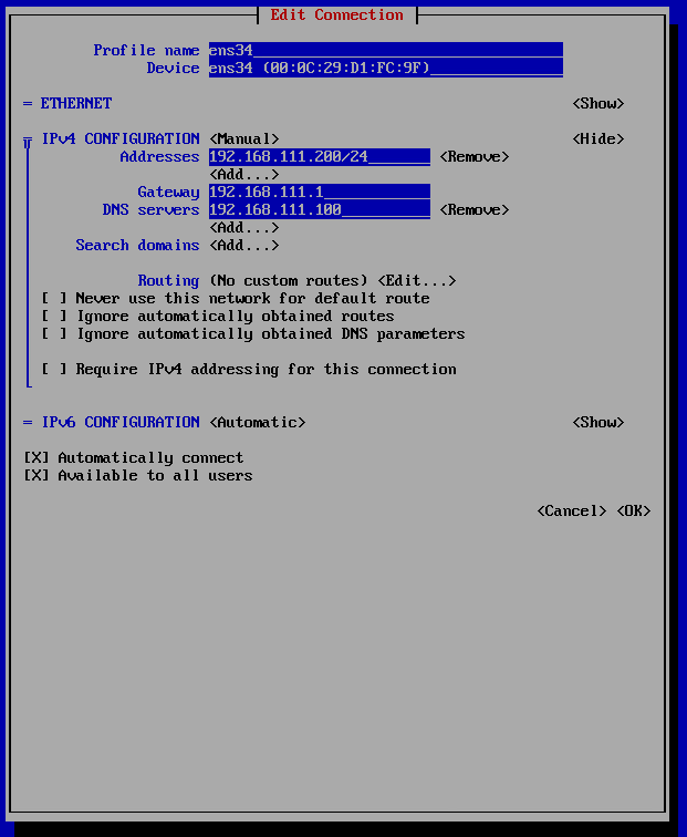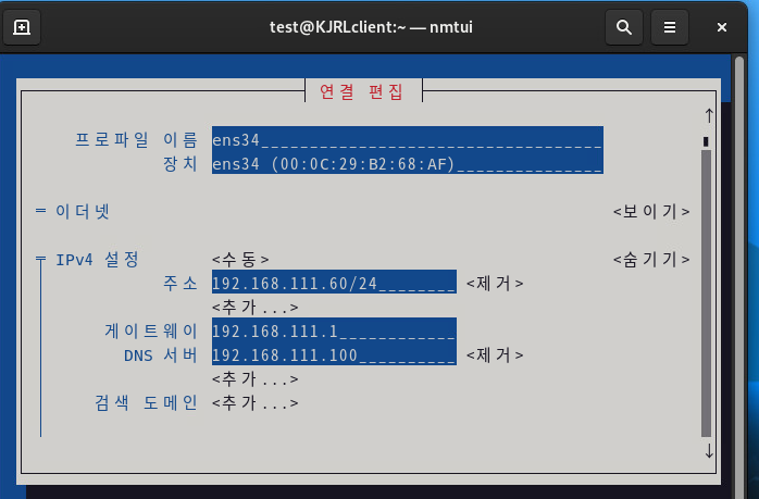 nmtui에서 DNS를 192.168.111.100으로 변경