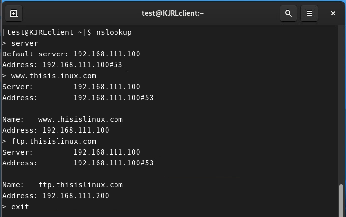 - 클라이언트에서 nslookup으로 질의했을 때 올바른 IP 주소가 반환되는 것 확인