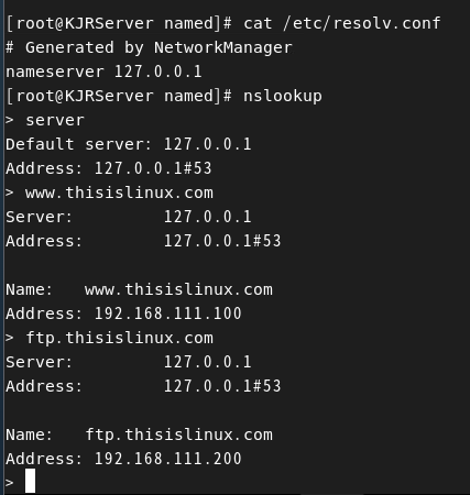 - 존(zone) 파일을 생성하여, www.thisislinux.com은 웹 서버(192.168.111.100), ftp.thisislinux.com은 FTP 서버(192.168.111.200)에 연결되도록 구성