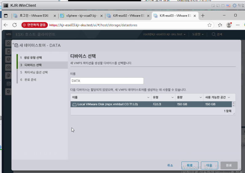 - 추가 하드디스크(150GB) 인식 → 데이터스토어(DATA) 생성