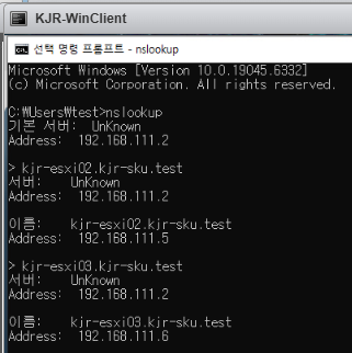 윈도우 클라이언트 서버에서 nslookup으로 kjr-esxi02.kjr-sku.test, kjr-esxi03.kjr-sku.test 정상 확인.