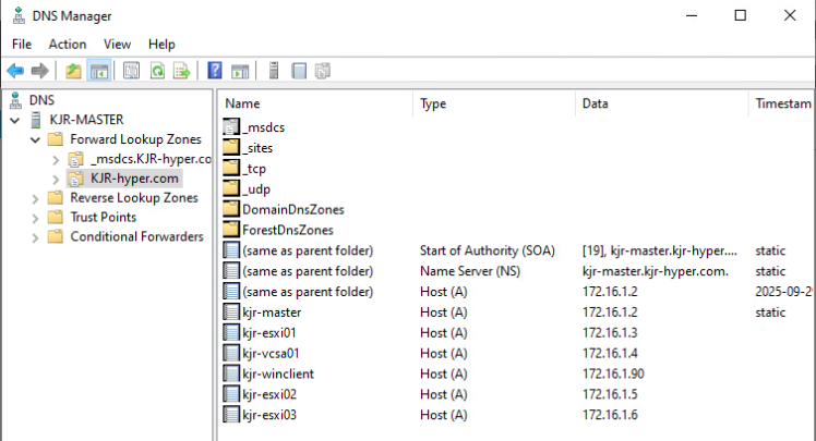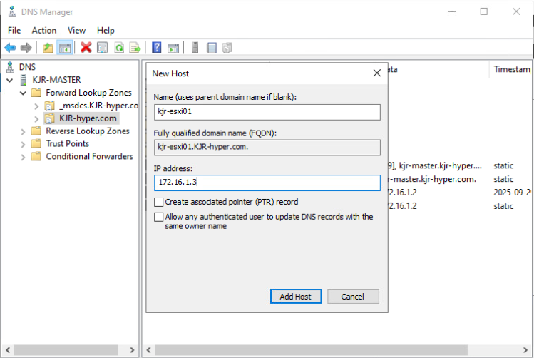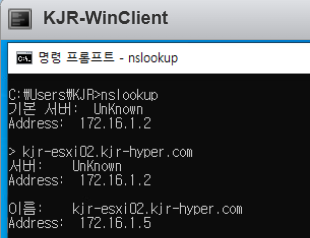 - nslookup kjr-esxi01.kjr-hyper.com → 172.16.1.3 정상 해석