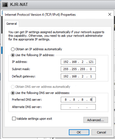 | KJR-NAT | NAT 서버 | 172.16.1.1(내부)/ 192.168.2.121/24(외부) |