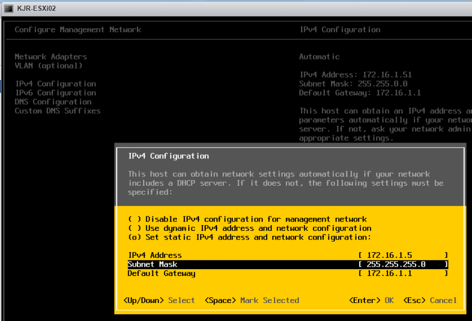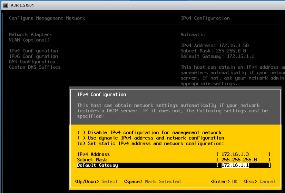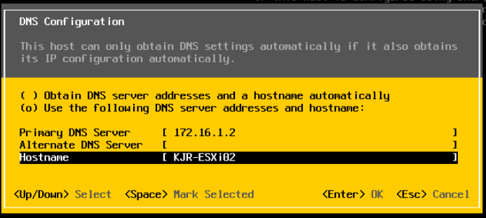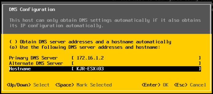 각 ESXi 호스트는 고정 IP와 게이트웨이, DNS를 지정하고 도메인 규칙에 맞는 호스트명을 부여하였다.