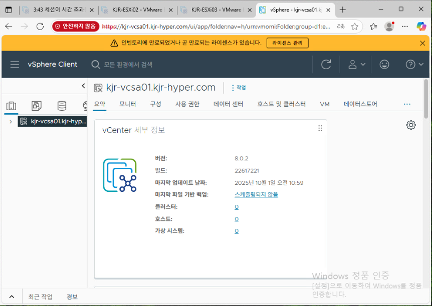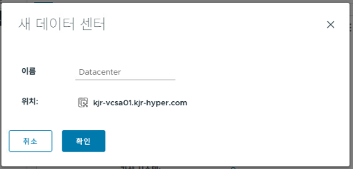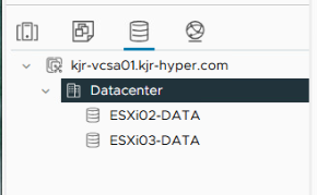 kjr-vcsa01.kjr-hyper.com 아래에 Datacenter가 생성된 것을 확인할 수 있다.