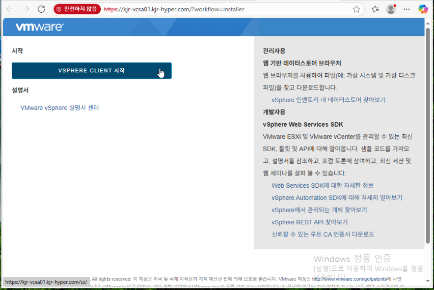 브라우저에서 kjr-esxi01.kjr-hyper.com에 접속하여 [VSPHERE CLIENT 시작] 클릭