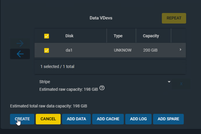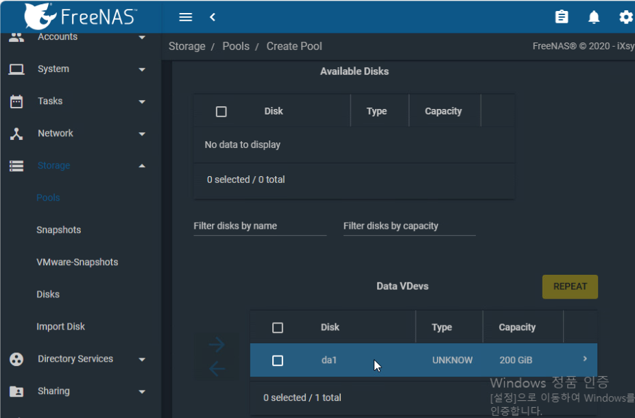 디스크 da1(200GB) 선택하고 우측으로 이동시킨다.