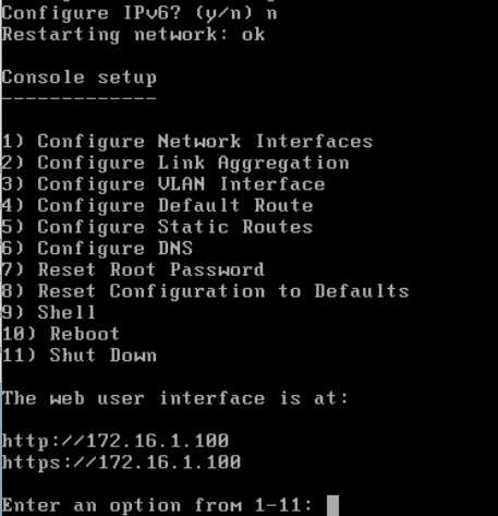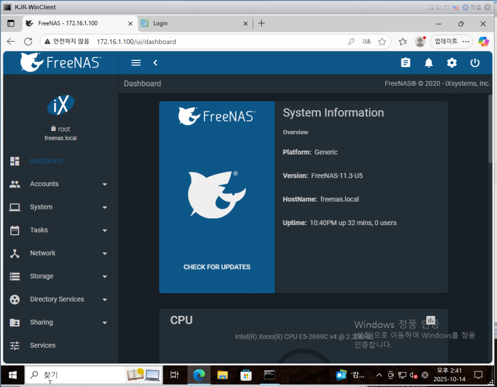 브라우저에서 172.16.1.100으로 접속하여 FreeNAS 웹 관리 콘솔에 로그인한다.