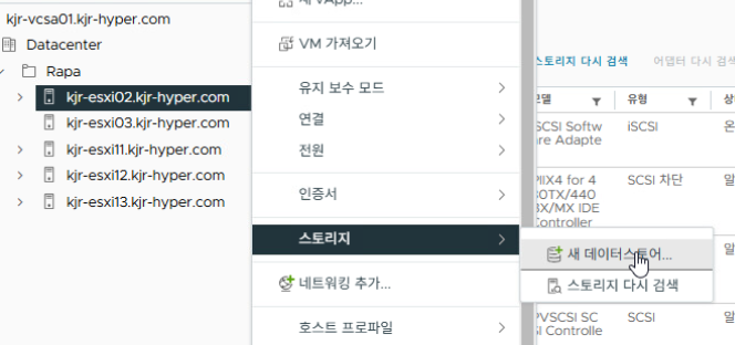 kjr-esxi02.kjr-hyper.com 호스트를 우클릭하여 "스토리지 → 새 데이터스토어"