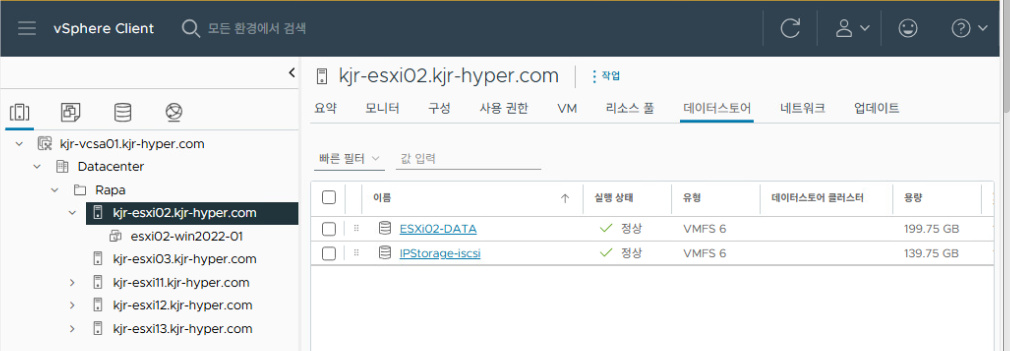 모두 동일한 IPStorage-iSCSI 데이터스토어를 인식한 것을 확인할 수 있다.
