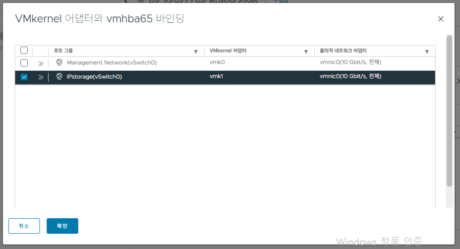 VMkernel 어댑터 vmhba65 바인딩 설정