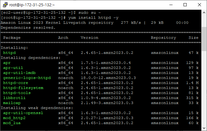슈퍼 유저로 변경하고, http 데몬을 설치한다.