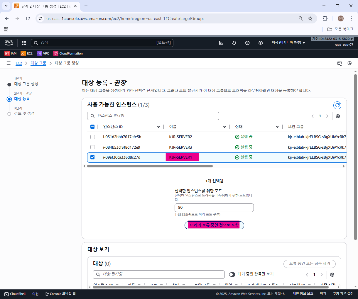 사용할 인스턴스 SERVER1을 대상으로 등록한 후 [대상 그룹 생성]
