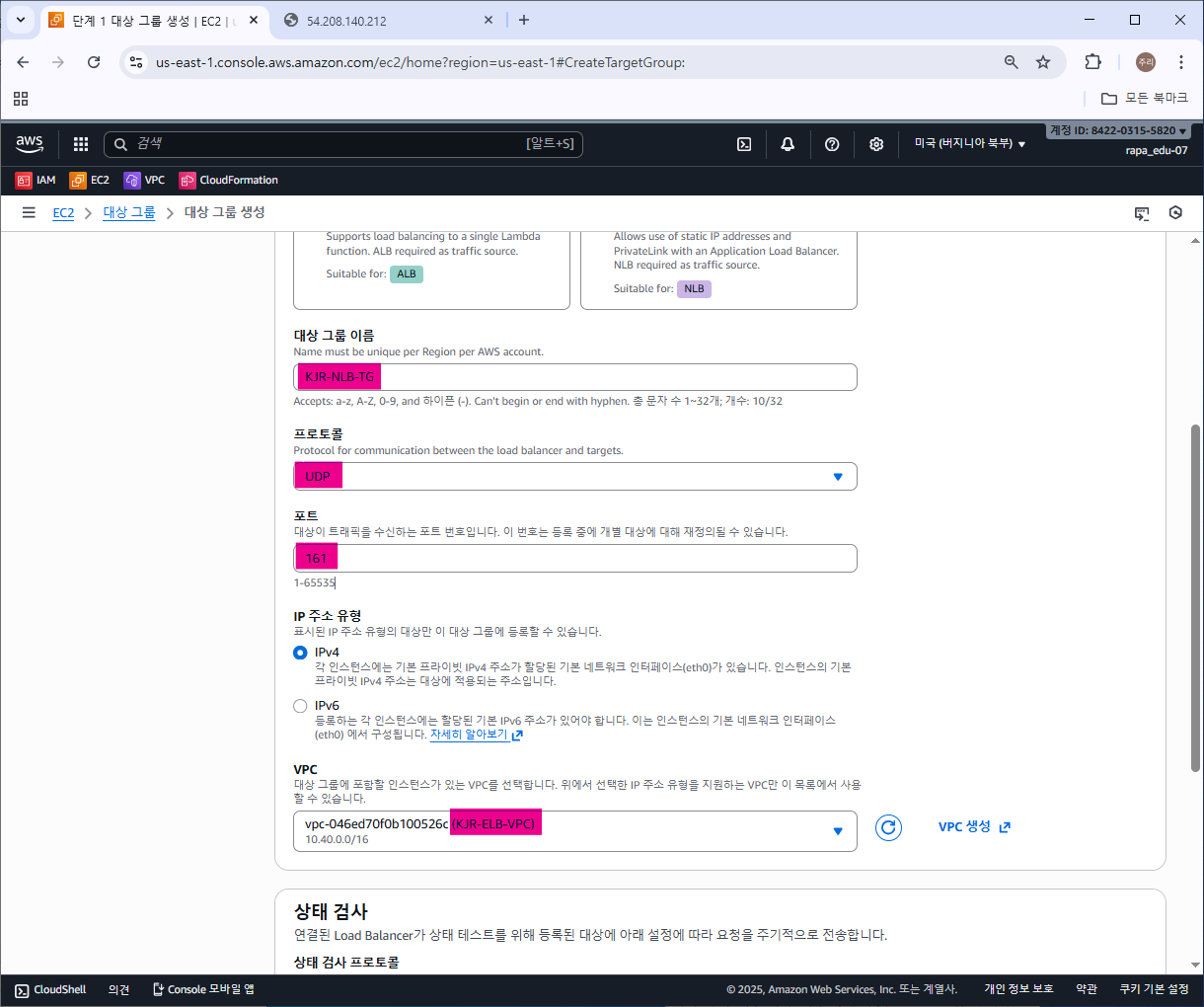 대상 그룹 이름, 프로토콜(UDP), 포트(161), VPC 지정