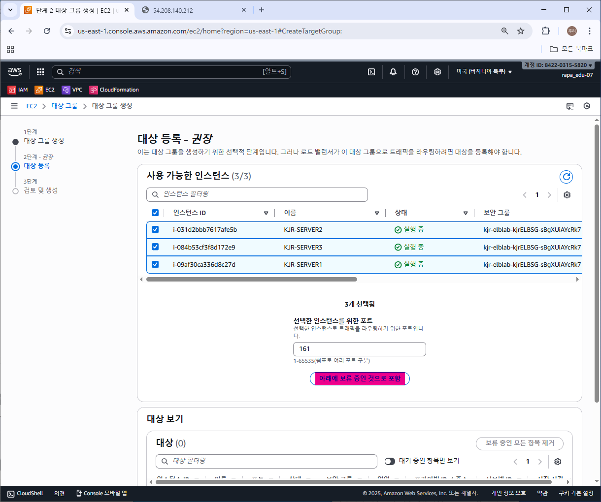 서버 인스턴스가 2개의 대상그룹(SERVER 1 / SERVER 2, 3)으로 분리된 것을 확인한다.