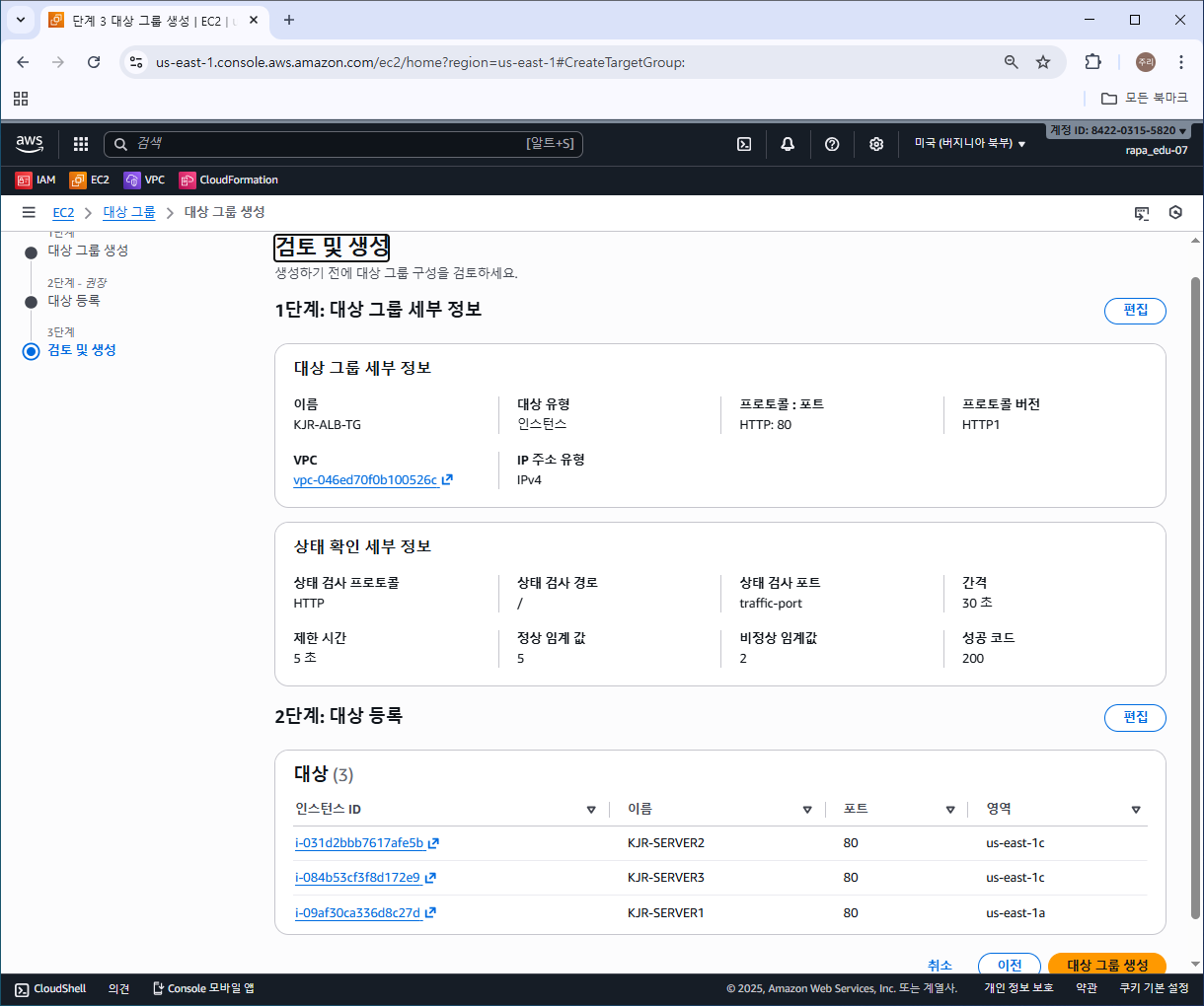 인스턴스를 대상으로 등록하고 [대상 그룹 생성]