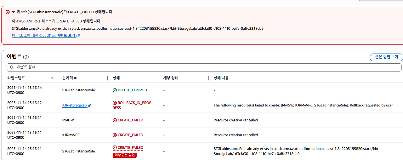 “리소스(STGLabInstanceRole)가 CREATE_FAILED 상태입니다.