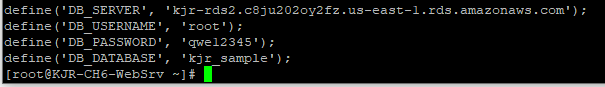 index.php 파일에서 DB_SERVER 값을 RDS2 엔드포인트 주소로 치환하고, 다시 상위 5줄을 확인하면 데이터베이스 주소로 바뀌어있는 것을 확인할 수 있다.