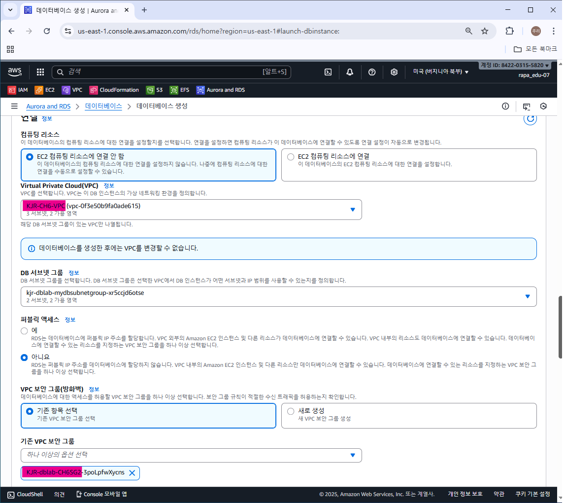 VPC와 보안그룹 선택 (기존 디폴트 보안그룹은 제거)