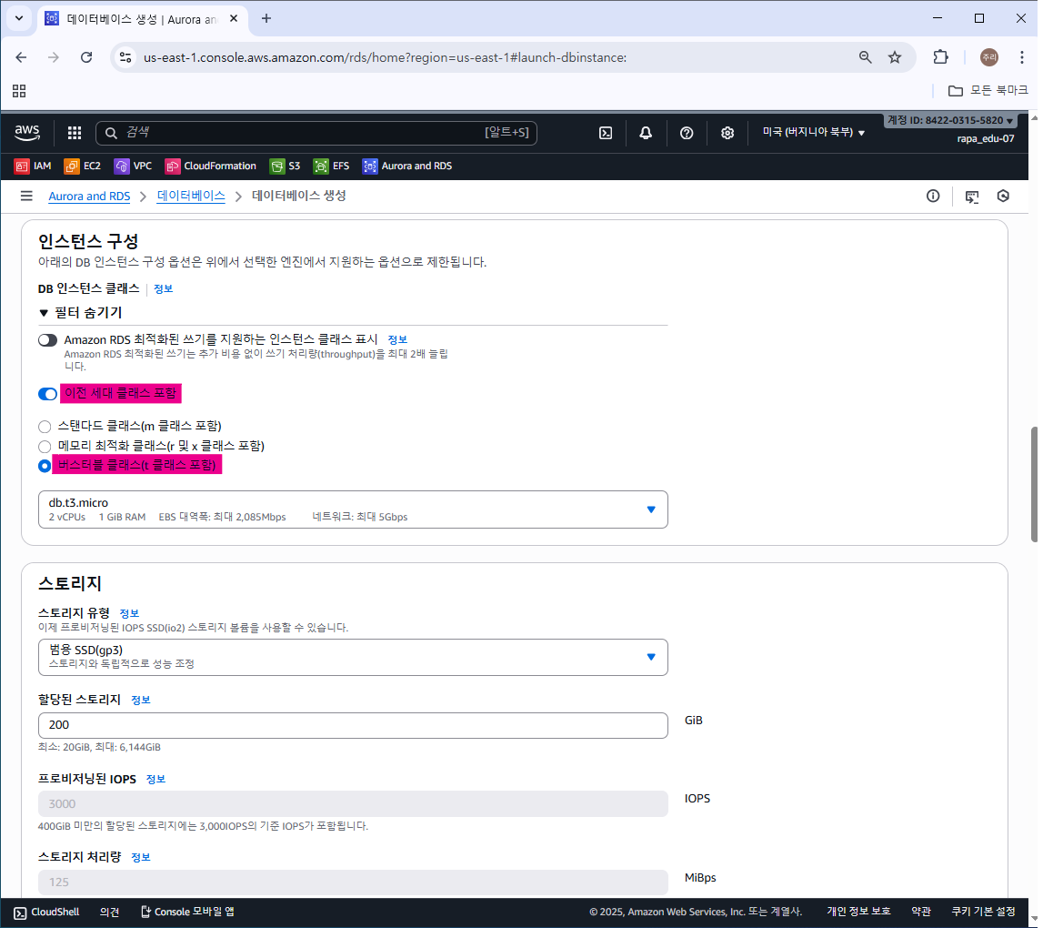 DB 인스턴스 식별자, 마스터 사용자 이름, 마스터 암호 지정