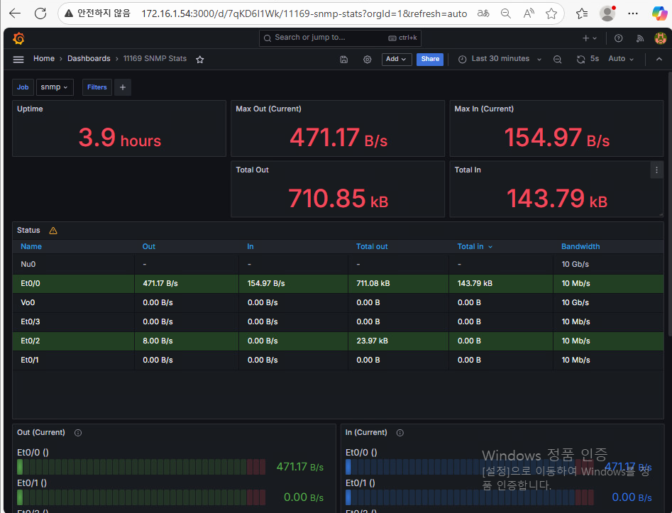 각 인터페이스로 들어온 바이트 수를 조회하는 SNMP 메트릭 쿼리 결과 및 그래프가 잘 나오는지 확인.